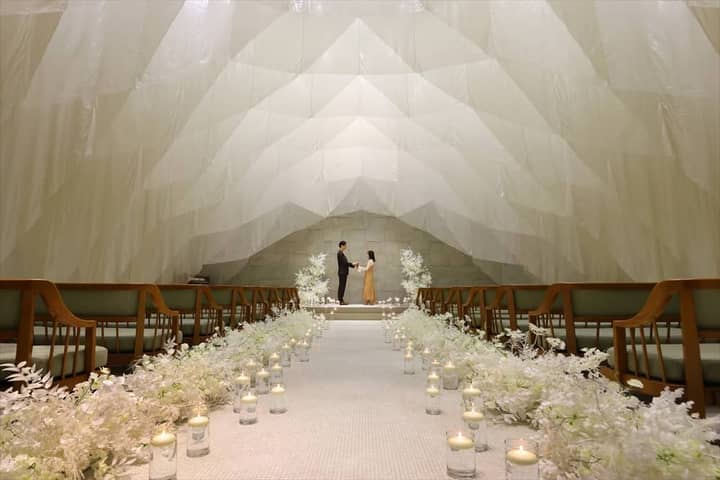 岡崎エリアで大人気!柔らかいヴェールに包まれた光のチャペルが魅力のブルー:ブラン。星空のライトアップの中、貸切のチャペルでプロポーズも素敵。幻想的な空間がおふたりを祝福します。